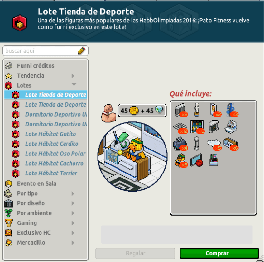 [INT] En venta: Lote Tienda de Deporte Hace 3 años Hidrolitico 6 Popular Archivada Información de la publicación Publicada: 26/06/2023 12:46:10 H.P.E. Autor: Hidrolitico Último comentario:@ngelytox Ir Visitas: 410 Información general Nombre: Lote Tienda de Deporte Precio: 45 + 45 | 99 Fecha de inicio de venta: 26/06/2023 Fecha de final de venta: 02/07/2023 Lugar de venta: Tienda + Habbo compras Imagen del catálogo Placa Lote Tienda de Deporte ¡Verifica esta placa!