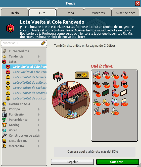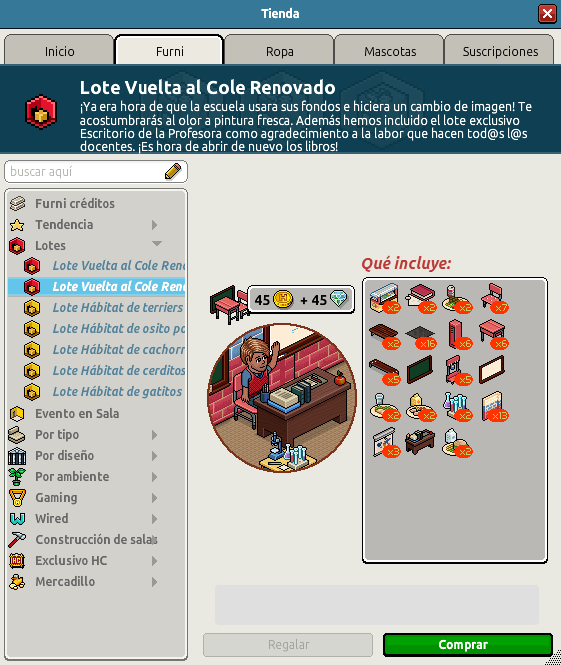 [INT] En venta: Lote Vuelta al Cole Renovado Hace 2 años Dantempo 13 Popular Archivada Información de la publicación Publicada: 09/09/2024 12:01:48 H.P.E. Autor: Dantempo Último comentario:@ngelytox Ir Visitas: 301 Información general Nombre: Lote Vuelta al Cole Renovado Precio: 45 + 45 | 99 Fecha de inicio de venta: 09/09/2024 Fecha de final de venta: 16/09/2024 Lugar de venta: Tienda + Habbo compras Imagen del catálogo Placa Lote Vuelta al Cole Renovado ¡Verifica esta placa!