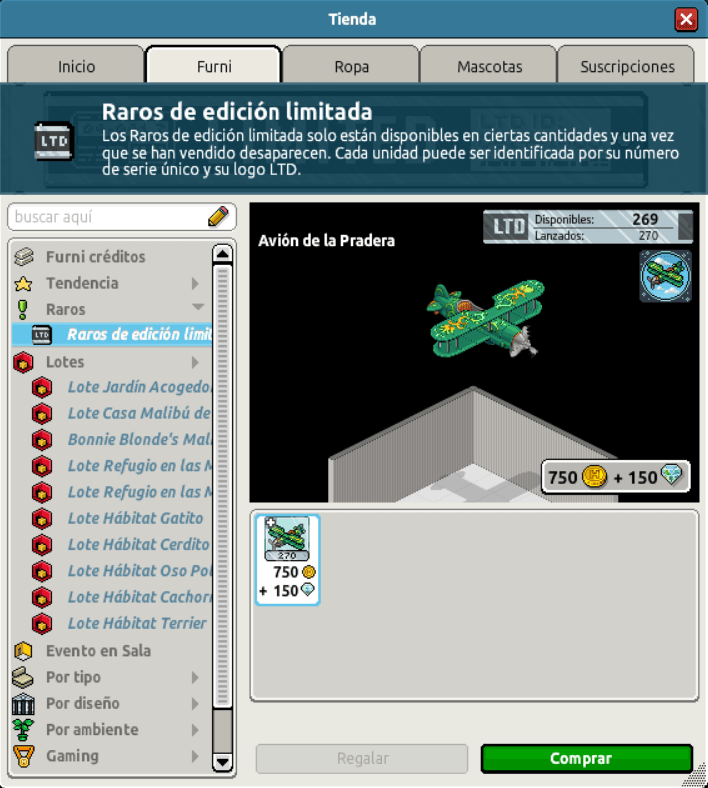 [INT] En venta: LTD Avión de la Pradera Hace 2 años Kyovyan 11 Popular Archivada Información de la publicación Publicada: 25/07/2023 17:00:57 H.P.E. Autor: Kyovyan Último comentario:@ngelytox Ir Visitas: 431 Información general Nombre: LTD Avión de la Pradera Precio: 750 + 150 Cantidad: 270 unidades Fecha de inicio de venta: 25/07/23 Fecha de final de venta: Hasta agotar sus unidades. Lugar de venta: Tienda Imágenes del ítem y catálogo Placa LTD Avión de la Pradera ¡Verifica esta placa!