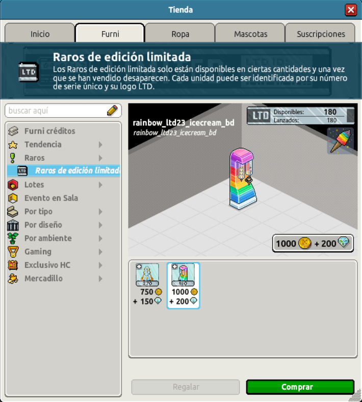 [INT] En venta: LTD Máquina de Helado Arcoíris Hace 3 años Hidrolitico 10 Popular Archivada Información de la publicación Publicada: 30/06/2023 17:00:48 H.P.E. Autor: Hidrolitico Último comentario:@ngelytox Ir Visitas: 539 Información general Nombre: LTD Máquina de Helado Arcoíris Precio: 1000 + 200 Cantidad: 180 unidades Fecha de inicio de venta: 30/06/2023 Fecha de final de venta: Hasta agotar sus unidades. Lugar de venta: Tienda Imagen del ítem y catálogo Placa LTD Heladera Arcoíris ¡Verifica esta placa!