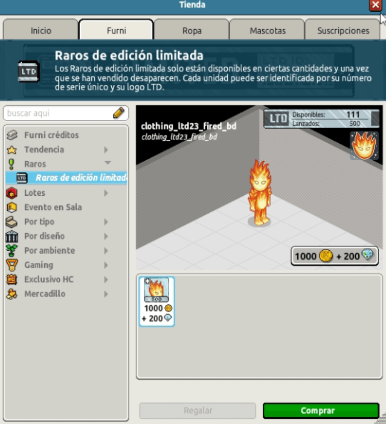 Nombre: LTD Traje Ser Supremo de Fuego Precio: 1000 + 200 Cantidad: 500 unidades Lugar de venta: Tienda Fecha de inicio de venta: 06/06/2023 Fecha de final de venta: Hasta agotar sus unidades.