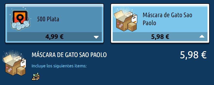 Categoría: Ropa Nombre: Máscara de Gato Sao Paolo Precio: 5,98 € Fecha de inicio de venta: 26/01/2024 Fecha de final de venta: 31/01/2024 Lugar de venta: Habbo Compras