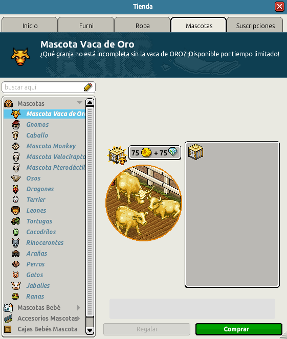 [INT] Cruce Especial: Vaca de Oro Hace 2 años Kyovyan 6 Popular Archivada Información de la publicación Publicada: 29/03/2024 19:09:37 H.P.E. Autor: Kyovyan Último comentario:maurodrama73 Ir Visitas: 902 Información general Categoría: Mascota Nombre: Vaca de oro Precio: 75 + 75 Fecha de inicio de venta: 29/03/2024 Fecha de final de venta: 31/03/2024 Lugar de venta: Tienda Imagen del catálogo Placa Dueño Mascota Vaca de Oro ¡Verifica esta placa!