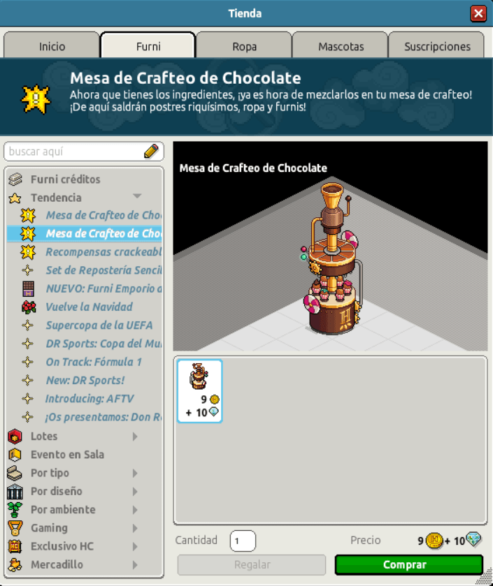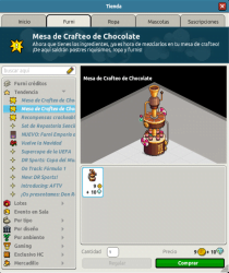 [INT] En venta: Mesa de Crafteo de Chocolate Hace 2 años Luuuuucia! 8 Popular Archivada Información de la publicación Publicada: 05/12/2023 13:09:02 H.P.E. Autor: Luuuuucia! Último comentario:@ngelytox Ir Visitas: 1505 Información general Nombre: Mesa de Crafteo de Chocolate Precio: 9 + 10 Fecha de inicio de venta: 05/12/23 Fecha de final de venta: 31/12/23 Lugar de venta: Tienda Número de ingredientes: 19 ingredientes Número de crafteos: 22 crafteos Imagen del ítem y catálogo Guía de Crafteo Ítems del Crafteo Retos de Crafteo de Chocolate: Haz clic aquí para más info.