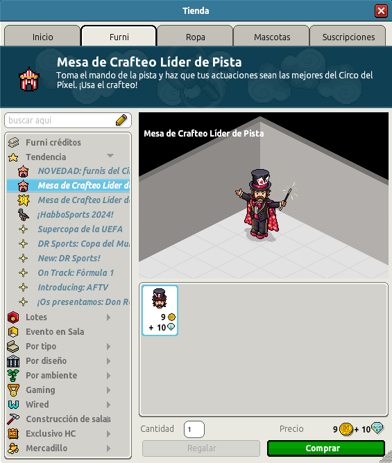 Nombre: Mesa de Crafteo Líder de Pista Precio: 9 + 10 Fecha de inicio de venta: 08/08/2024 Fecha de final de venta: 31/08/2024 Lugar de venta: Tienda Número de ingredientes: 10 ingredientes Número de crafteos: 7 crafteos