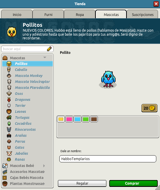 Categoría: Mascotas en venta Tipo: Pollito Precio: 20 Mascota normal: Sí Fecha de inicio de venta: 01/03/2025 Fecha de final de venta: Desconocido Lugar de venta: Tienda