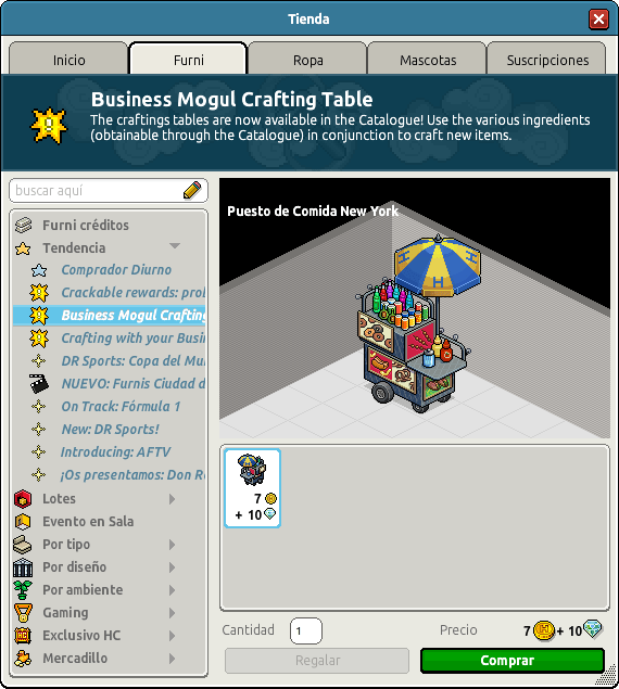 [INT] En venta: Puesto de Comida de New York Hace 3 años Dantempo 7 Popular Archivada Información de la publicación Publicada: 02/08/2023 12:51:11 H.P.E. Autor: Dantempo Último comentario:@ngelytox Ir Visitas: 1020 Información general Categoría: Nueva York Tipo: Furni Precio: 7 + 10 Fecha de inicio de venta: 02/08/2023 Fecha de final de venta: 31/08/2023 Lugar de venta: Tienda Disponible en BC: No Ítem + Imagen del catálogo Más información Como craftear: click aquí.