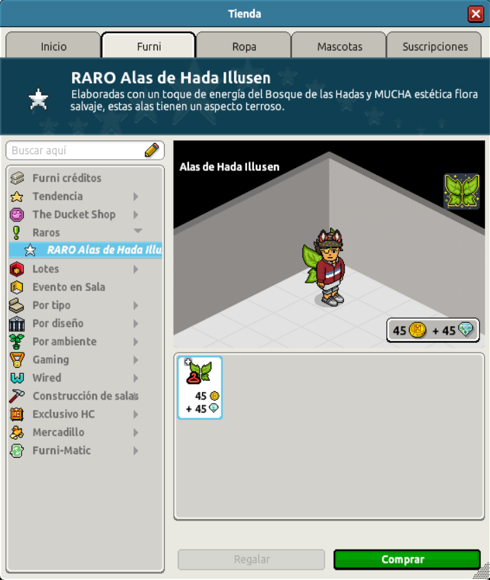 [INT] En venta: RARO Alas de Hada Ilussen Hace 4 semanas Agathys 11 Popular Información de la publicación Se archivará automáticamente en 1 mes. Publicada: 28/11/2025 13:02:10 H.P.E. Actualización: 14/12/2025 11:43:21 H.P.E. Autor: Agathys Último comentario:@ngelytox Ir Visitas: 200 Información general Categoría: Ropa Nombre: RARO Alas de Hada Ilussen Precio: 45 + 45 Fecha de inicio de venta: 28/11/2025 Fecha de final de venta: 01/12/2025 Lugar de venta: Tienda Imagen del ítem y catálogo Placa Raro Alas de Hada Ilussen ¡Verifica esta placa!