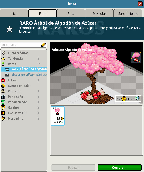 Categoría: Furni Nombre: RARO Árbol de Algodón de Azúcar Precio: 25 + 25 Fecha de inicio de venta: 01/12/2023 Fecha de final de venta: 04/12/2023 Lugar de venta: Tienda