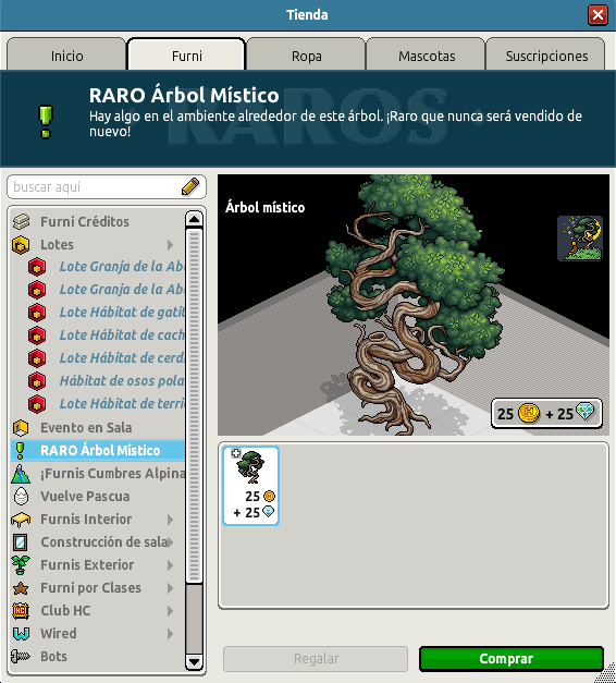 El raro de hoy recibe el nombre de RARO Árbol Místico. Si es de tu agrado y crees que puedes hacerle hueco en alguna de tus salas, podrás hacerte con él por un precio de 25