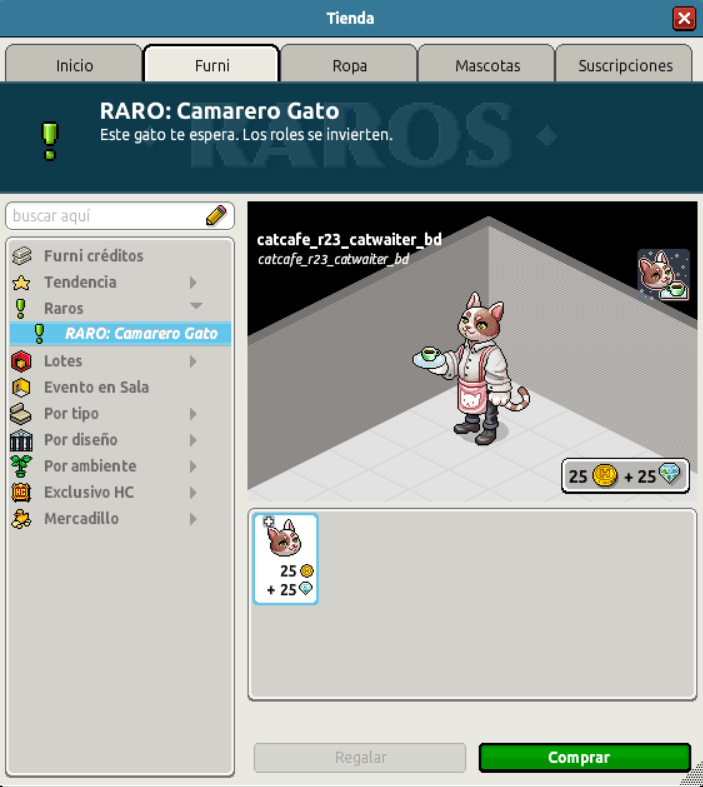 [INT] En venta: RARO Camarero Gato Hace 3 años Luuuuucia! 13 Popular Archivada Información de la publicación Publicada: 19/05/2023 13:02:15 H.P.E. Autor: Luuuuucia! Último comentario:@ngelytox Ir Visitas: 758 Información general Nombre: RARO Camarero Gato Precio: 25 + 25 Fecha de inicio de venta: 19/05/23 Fecha de final de venta: 22/05/23 Lugar de venta: Tienda Categoría: Furni Imagen del ítem y catálogo Placa RARO Camarero Gato ¡Verifica esta placa!