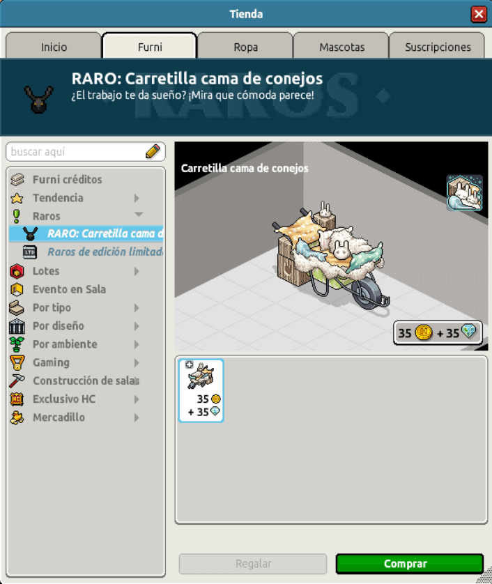 [INT] En venta: RARO Carretilla Cama de Conejos Hace 2 años Luuuuucia! 7 Popular Archivada Información de la publicación Publicada: 15/03/2024 13:00:57 H.P.E. Autor: Luuuuucia! Último comentario:lifePOV Ir Visitas: 585 Información general Categoría: Furni Nombre: RARO Carretilla Cama de Conejos Precio: 35 + 35 Fecha de inicio de venta: 15/03/2024 Fecha de final de venta: 18/03/2024 Lugar de venta: Tienda Imagen del ítem y catálogo Placa Carretilla Cama de Conejos ¡Verifica esta placa!