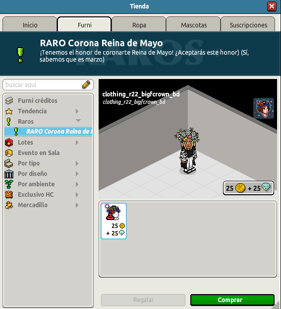 Como es costumbre en Habbo cada semana se lanza un nuevo raro para la adquisición de todos. En esta semana semana se decidió alojar uno con un diseño muy especial. ¿Te gustaría saber de qué raro estamos hablando? Si es así, sigue leyendo para no perderte de ningún detalle. En el día de hoy hablaremos de el RARO Corona de la Reina de Mayo el cual estará disponible a partir de hoy en el catálogo, recuerda que es por tiempo Limitado y para adquirirlo debes ser rápido. Este raro cuesta 25 + 25 sin más dilación, procedamos a ver juntos el diseño del raro:
