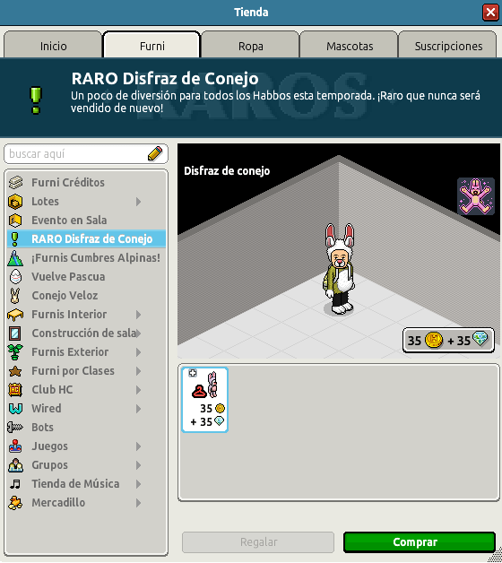 Ya se encuentra disponible para su compra a través del catálogo el Raro Disfraz de Conejo. ¿Qué mejor que disfrazarse de conejo en este mes dedicado a la Pascua? Podrás hacerte con este raro por un precio de 35