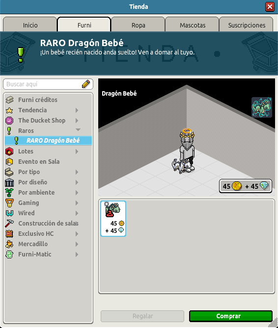 [INT] En venta: RARO Dragón Bebé Hace 6 horas Agathys 2 Información de la publicación Se archivará automáticamente en 2 meses. Publicada: 10/04/2026 13:01:23 H.P.E. Autor: Agathys Último comentario:-.sunflower.- Ir Visitas: 66 Información general Categoría: Furni Nombre: Dragón Bebé Precio: 45 + 45 Fecha de inicio de venta: 10/04/2026 Fecha de final de venta: 13/04/2026 Lugar de venta: Tienda Imágenes del ítem y de catálogo Placa Raro Dragón Bebé ¡Verifica esta placa!