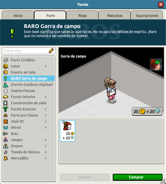 El raro que ha aparecido hoy en la tienda recibe el nombre de Raro Gorra de Campo. Si quieres hacerte con una gorra, podrás adquirirla por un precio de 25
