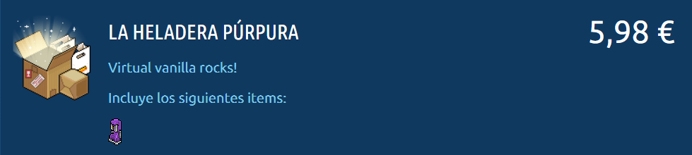 Nombre: La Heladera Púrpura Precio: 5,98€ Fecha de inicio de venta: 22/02/2024 Fecha de final de venta: 26/02/2024 Lugar de venta: Habbo Compras Categoría: Furni