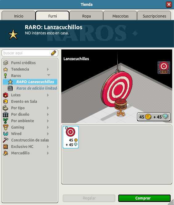 [INT] En venta: RARO Lanzacuchillos Hace 2 años Kyovyan 4 Popular Archivada Información de la publicación Publicada: 16/08/2024 12:00:37 H.P.E. Autor: Kyovyan Último comentario:@ngelytox Ir Visitas: 355 Información general Categoría: Furni Nombre: Lanzacuchillos Precio: 45 + 45 Fecha de inicio de venta: 16/08/2024 Fecha de final de venta: 19/08/2024 Lugar de venta: Tienda Imágenes del ítem y de catálogo Placa RARO: Lanzacuchillos ¡Verifica esta placa!