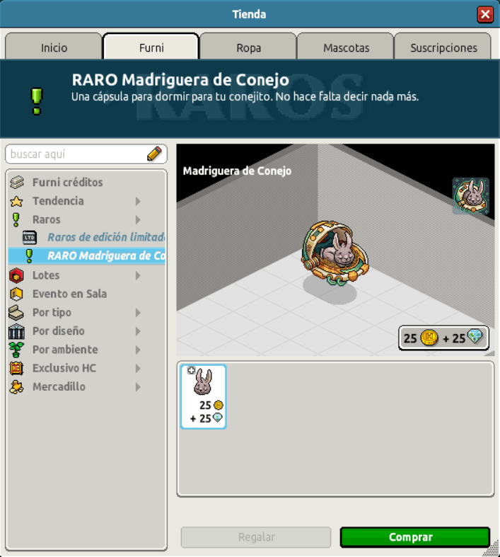 [INT] En venta: RARO Madriguera de Conejo Hace 3 años -d-selene-b- 14 Popular Archivada Información de la publicación Publicada: 28/04/2023 13:01:53 H.P.E. Autor: -d-selene-b- Último comentario:@ngelytox Ir Visitas: 865 Información general Nombre: RARO Madriguera de Conejo Precio: 25 + 25 Fecha de inicio de venta: 28/04/23 Fecha de final de venta: 01/05/23 Lugar de venta: Tienda Categoría: Furni Imagen del ítem y catálogo Placa RARO Madriguera de Conejo ¡Verifica esta placa!