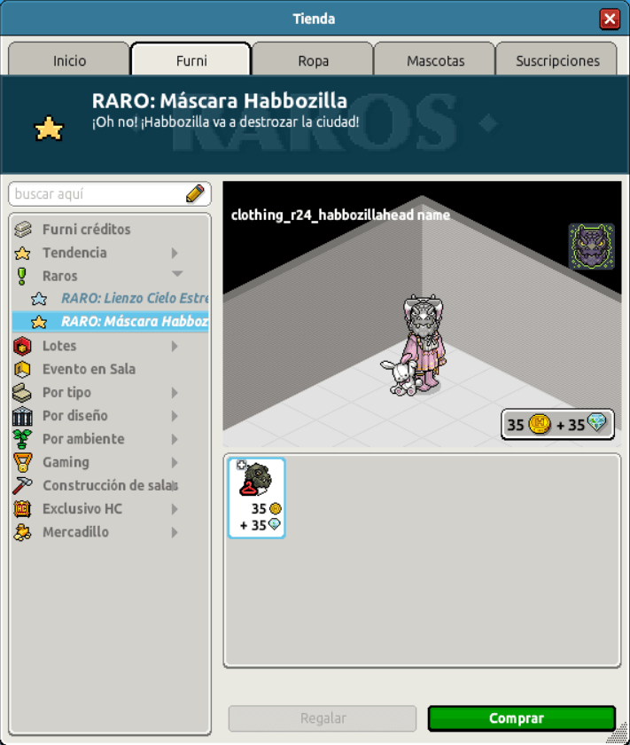 [INT] En venta: RARO Máscara Habbozilla Hace 2 años Kyovyan 19 Popular Archivada Información de la publicación Publicada: 12/04/2024 13:00:52 H.P.E. Autor: Kyovyan Último comentario:@ngelytox Ir Visitas: 858 Información general Categoría: Ropa Nombre: RARO Máscara Habbozilla Precio: 35 + 35 Fecha de inicio de venta: 12/04/2024 Fecha de final de venta: 15/04/2024 Lugar de venta: Tienda Imagen del ítem y catálogo Placa Máscara Habbozilla ¡Verifica esta placa!