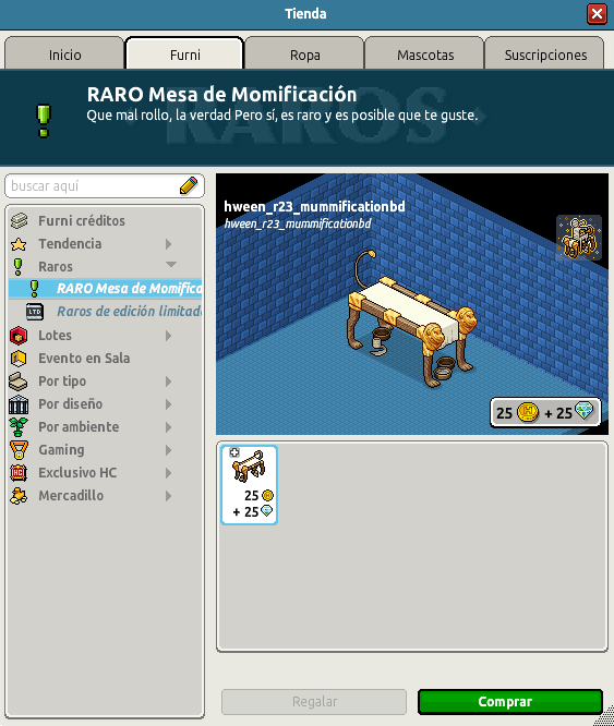 [INT] En venta: RARO Mesa de Momificación Hace 3 años mateo54759 6 Popular Archivada Información de la publicación Publicada: 13/10/2023 13:05:39 H.P.E. Autor: mateo54759 Último comentario:@ngelytox Ir Visitas: 680 Información general Categoría: Furni Nombre: RARO Mesa de Momificación Precio: 25 + 25 Fecha de inicio de venta: 13/10/23 Fecha de final de venta: 16/10/23 Lugar de venta: Tienda Imagen del ítem y catálogo Placa RARO Mesa de Momificación ¡Verifica esta placa!