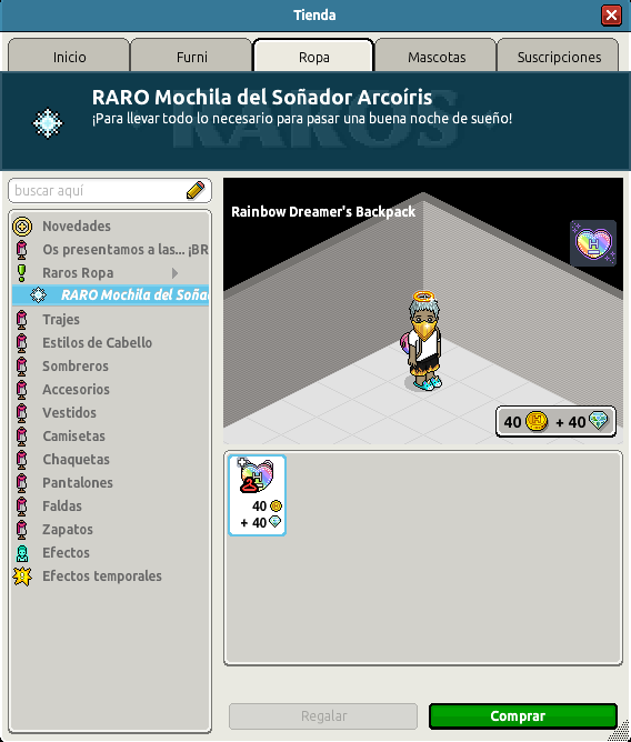 [INT] En venta: RARO Mochila del Soñador Arcoíris Hace 1 año Luuuuucia! 11 Popular Archivada Información de la publicación Publicada: 29/11/2024 13:03:02 H.P.E. Autor: Luuuuucia! Último comentario:@ngelytox Ir Visitas: 488 Información general Categoría: Ropa Nombre: Mochila del Soñador Arcoíris Precio: 40 + 40 Fecha de inicio de venta: 29/11/2024 Fecha de final de venta: 02/12/2024 Lugar de venta: Tienda Imagen del ítem y catálogo Placa RARO Mochila del Soñador Arcoíris ¡Verifica esta placa!