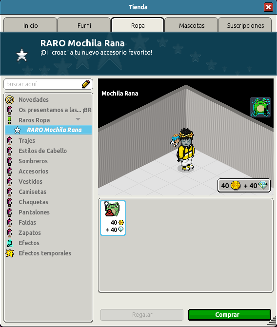 [INT] En venta: RARO Mochila Ranita Hace 1 año Agathys 12 Popular Archivada Información de la publicación Publicada: 14/03/2025 13:00:57 H.P.E. Actualización: 16/03/2025 16:13:56 H.P.E. Autor: Agathys Último comentario:@ngelytox Ir Visitas: 443 Información general Categoría: Ropa Nombre: Mochila Ranita Precio: 40 + 40 Fecha de inicio de venta: 14/03/2025 Fecha de final de venta: 17/03/2025 Lugar de venta: Tienda Imagen del ítem y catálogo Placa RARO Mochila Ranita ¡Verifica esta placa!