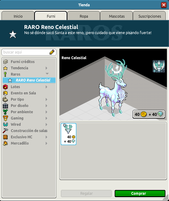 [INT] En venta: RARO Reno Celestial Hace 11 meses Kyovyan 16 Popular Archivada Información de la publicación Publicada: 13/12/2024 13:01:35 H.P.E. Autor: Kyovyan Último comentario:@ngelytox Ir Visitas: 350 Información general Categoría: Furni Nombre: Reno Celestial Precio: 40 + 40 Fecha de inicio de venta: 13/12/2024 Fecha de final de venta: 16/12/2024 Lugar de venta: Tienda Imágenes del ítem y de catálogo Placa RARO Reno Celestial ¡Verifica esta placa!