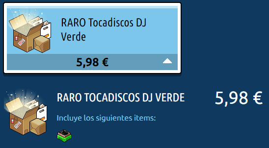 Nombre: RARO Tocadiscos Precio: 5,98 € Fecha de inicio de venta: 23/05/2023 Fecha de final de venta: 26/05/2023 Lugar de venta: Habbo compras Categoría: Furni