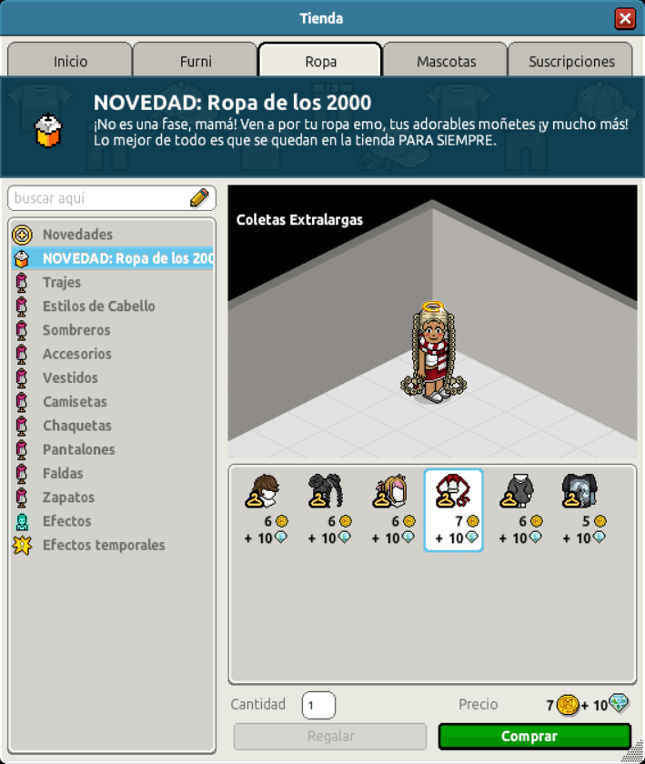 Categoría: Habbo Historia Tipo: Prendas normales Precio: Entre 5 + 10 y 7 + 10 Fecha de inicio de venta: 03/06/2024 Fecha de final de venta: Indefinida Lugar de venta: Tienda