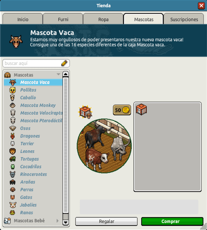[INT] En venta: Vacas y Pollitos Hace 3 años Luuuuucia! 8 Popular Archivada Información de la publicación Publicada: 12/04/2023 13:45:18 H.P.E. Autor: Luuuuucia! Último comentario:@ngelytox Ir Visitas: 708 Información general Categoría: Mascotas en venta Tipo: Pollito y Vaca Precio: 20 y 50 Mascota normal: Sí Fecha de inicio de venta: 12/04/2023 Fecha de final de venta: Desconocido Lugar de venta: Tienda Imagen del catálogo Placa Dueño Mascota Vaca ¡Verifica esta placa!