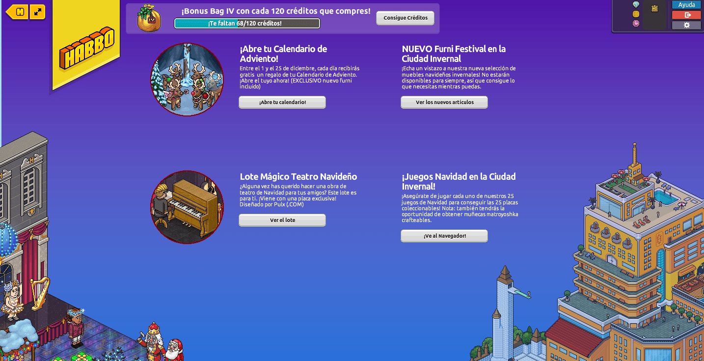 La campaña Ciudad Invernal, al fin ha llegado a Habbo y con ella un montón de nuevas sorpresas, entre estas, podemos destacar los nuevos furnis, junto a un nuevo lote, una nueva vista, los furnis clásicos… ¡hay a elegir muchísimos furnis! ¿Quiéres conocer toda la información? ¡Pues sigue leyendo!