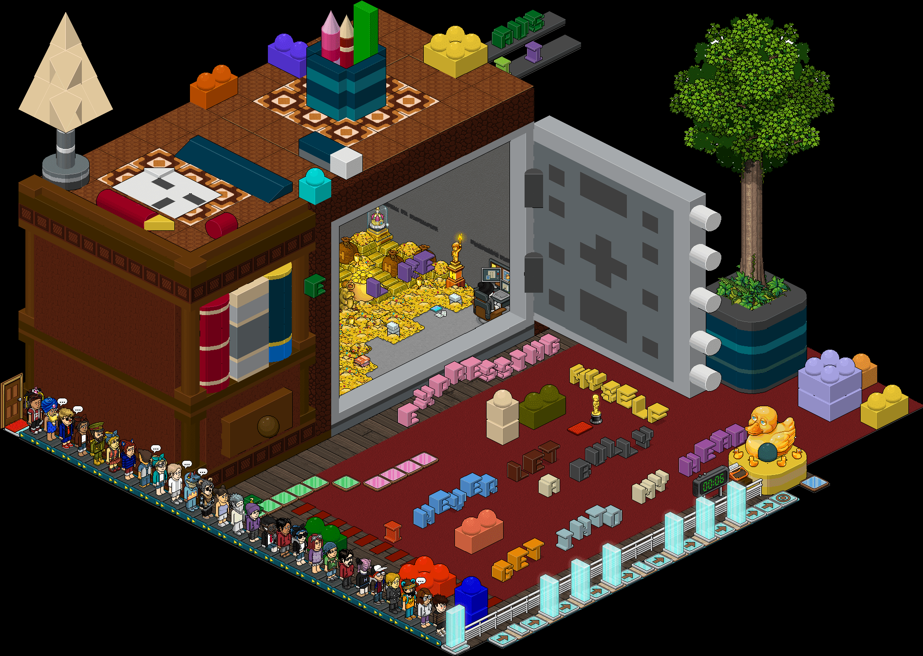 El juego consiste en andar hasta la casilla a presión cuando el bot no esté sentado en la silla. Una vez llegues recibirás tu placa: