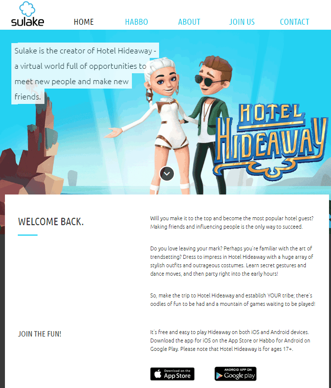 Hoy, después de mucho tiempo, Sulake ha inaugurado su nuevo proyecto. Lleva trabajando en él muchísimos años, y aunque se podía entrar ya a jugar en varios países, al fin se ha hecho oficial su llegada. Tal es así, que la página oficial de Sulake ha puesto a Habbo en un segundo lugar y, en vez de entrar y ver el logo de su primer proyecto, ha colocado el nuevo logo del «Hotel Hideaway«.