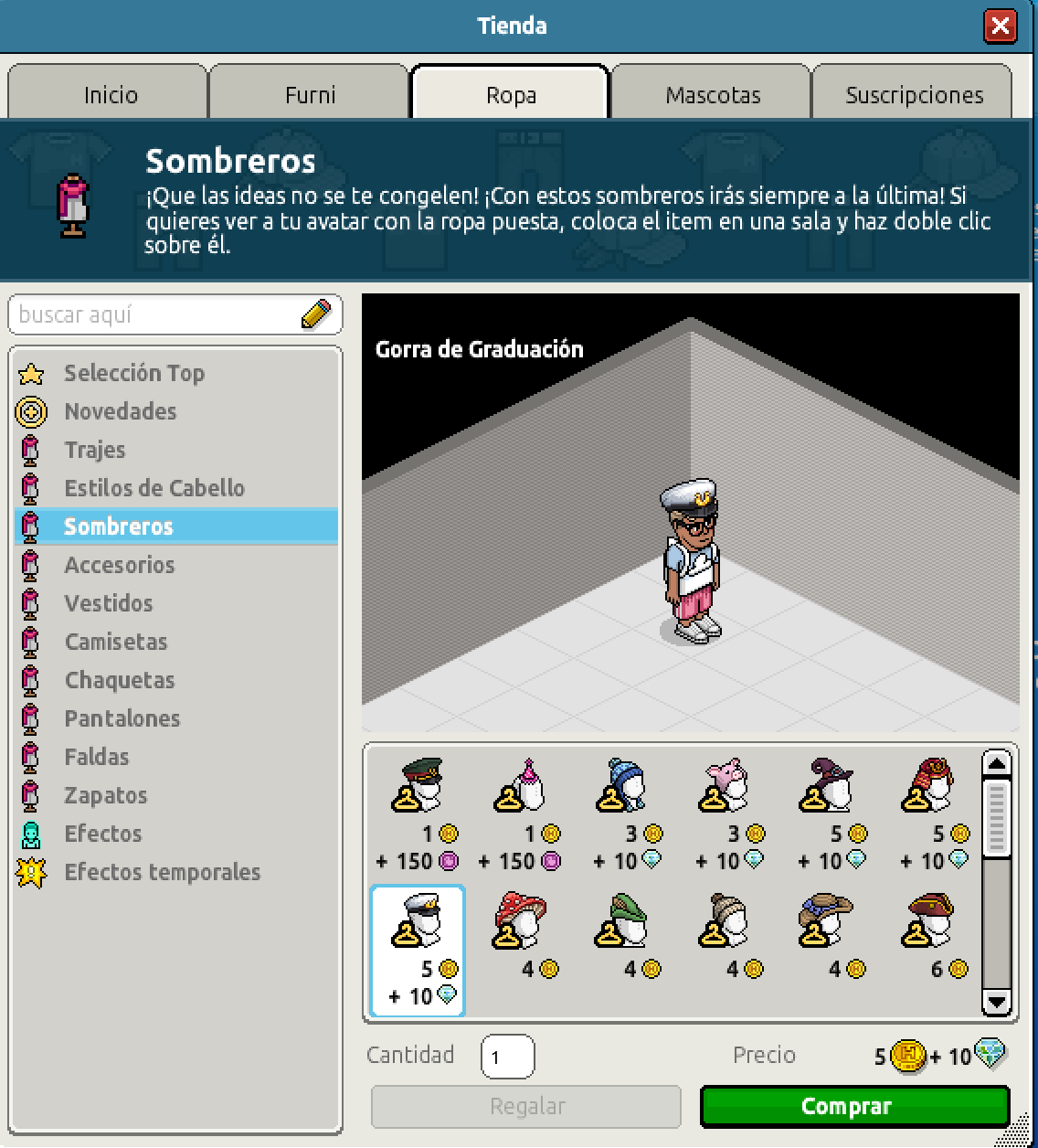 La nueva prenda disponible en la tienda recibe el nombre de «Gorra de Graduación» y podrás comprarla en la tienda > sección ropa > sombreros por un precio de 5