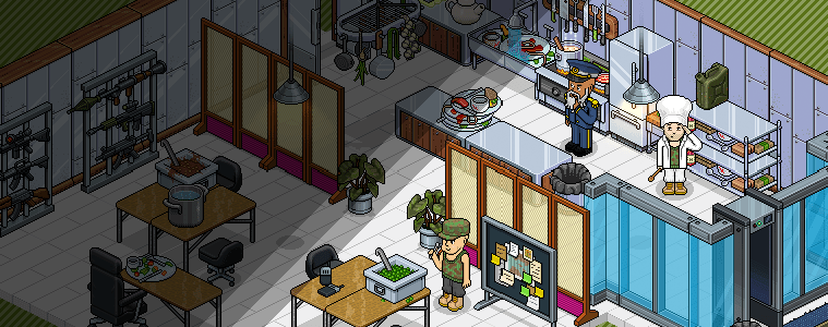 Así es, la primera imagen destacada está destinada para el nuevo lote «Comedor Militar«, lleno de diversión y muchos platillos, seguida de otra imagen destinada para el mismo lote y por último, tenemos a la llegada de una nueva Fansitie a uno de los Habbo Hoteles a nivel internacional, llamada «Habbang«. A continuación, puedes echarles un vistazo a cada una de las imágenes.