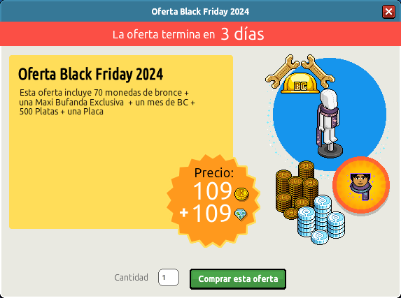 [INT] Oferta: Black Friday 2024 Hace 1 año Dantempo 10 Popular Archivada Información de la publicación Publicada: 29/11/2024 13:23:36 H.P.E. Autor: Dantempo Último comentario:@ngelytox Ir Visitas: 765 Información general Nombre: Black Friday 2024 Precio: 109 + 109 | 199 + 199 Ítems exclusivos: Sí Placa por compra: Sí Lugar de venta: Ventana emergente Imagen de oferta Ítems de la oferta Oferta: 109 + 109 1 mes 70 500 Oferta: 199 + 199 x2 3 meses 80 500 Recompensa Maxi Bufanda ¡Verifica esta placa!