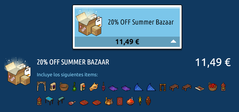 Nombre: Descuento en Furnis Bazar Nº de descuento: 20% Precio: 11,49€ Ítems exclusivos: No Placa por compra: Sí Fecha de inicio de venta: 26/02/2024 Fecha de final de venta: 29/02/2024 Lugar de venta: Habbo Compras