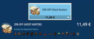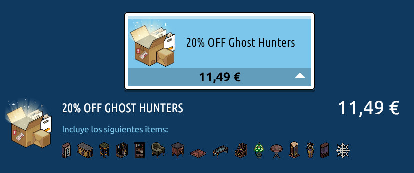 [INT] Oferta: Furnis Caza-Fantasmas Hace 3 años mateo54759 8 Popular Archivada Información de la publicación Publicada: 23/10/2023 16:04:56 H.P.E. Actualización: 26/10/2023 14:00:51 H.P.E. Autor: mateo54759 Último comentario:@ngelytox Ir Visitas: 497 Información general Nombre: Furnis Caza-Fantasmas Descuento: 20% Precio: 11,49€ Ítems exclusivos: No Placa por compra: Sí Fecha de inicio de venta: 23/10/2023 Fecha de final de venta: 26/10/2023 Lugar de venta: Habbo Compras Imagen de la oferta Ítems de la oferta Placa de recompensa Oferta Habboween 2023 Cazadores de Fantasmas ¡Verifica esta placa!