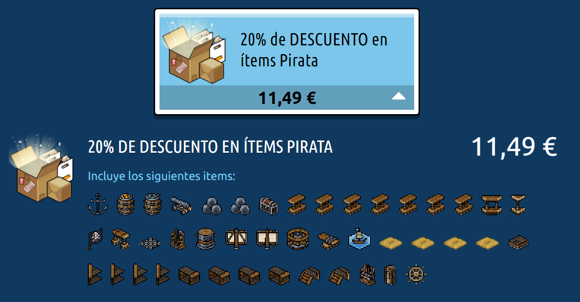 [INT] Oferta: Furnis Pirata Hace 2 años Dantempo 9 Popular Archivada Información de la publicación Publicada: 27/07/2023 11:19:57 H.P.E. Autor: Dantempo Último comentario:@ngelytox Ir Visitas: 570 Información general Nombre: 20% de Descuento en los ítems Pirata Descuento: 20% Precio: 11,49€ Ítems exclusivos: No Placa por compra: Sí Fecha de inicio de venta: 27/07/2023 Fecha de final de venta: 30/07/2023 Lugar de venta: Habbo Compras Imagen de oferta Ítems de la oferta x2 x2 x4 x4 x4 x7 Placa de recompensa Oferta ítems Pirata ¡Verifica esta placa!
