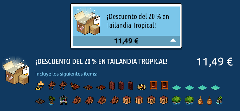 Nombre: Descuento en Furnis Tailandia Tropical Nº de descuento: 20% Precio: 11,49€ Ítems exclusivos: No Placa por compra: Sí Fecha de inicio de venta: 18/01/2024 Fecha de final de venta: 22/01/2024 Lugar de venta: Habbo Compras