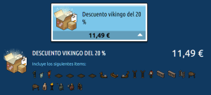 [INT] Oferta: Furnis Vikingos Hace 2 años Kyovyan 10 Popular Archivada Información de la publicación Publicada: 02/02/2024 12:57:25 H.P.E. Autor: Kyovyan Último comentario:@ngelytox Ir Visitas: 482 Información general Nombre: Descuento en Furnis Vikingos Nº de descuento: 20% Precio: 11,49€ Ítems exclusivos: No Placa por compra: Sí Fecha de inicio de venta: 02/02/2024 Fecha de final de venta: 05/02/2024 Lugar de venta: Habbo Compras Imagen de la oferta Ítems de la oferta x4 x2 x2 x2 Placa de recompensa Oferta vikinga 2024 ¡Verifica esta placa!