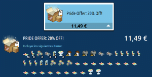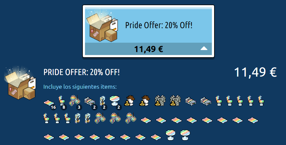 [INT] Oferta: Mes del Orgullo Hace 3 años Kyovyan 9 Popular Archivada Información de la publicación Publicada: 28/06/2023 12:21:49 H.P.E. Autor: Kyovyan Último comentario:@ngelytox Ir Visitas: 374 Información general Nombre: Oferta Mes del Orgullo Descuento: 20% Precio: 11,49€ Fecha de inicio de venta: 28/06/2023 Fecha de final de venta: 01/07/2023 Lugar de venta: Habbo Compras Placa por compra: Sí Imagen de oferta Ítems de la oferta x8 x2 x3 x16 x2 x2 x2 x2 Placa Habbo Pride 2023 ¡Verifica esta placa!