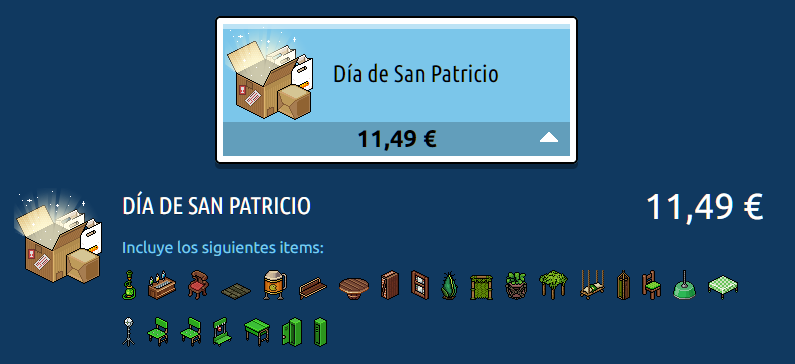 [INT] Oferta: San Patricio 2024 Hace 2 años Kyovyan 7 Popular Archivada Información de la publicación Publicada: 15/03/2024 12:23:44 H.P.E. Autor: Kyovyan Último comentario:lifePOV Ir Visitas: 481 Información general Nombre: Oferta de San Patricio 2024 Nº de descuento: 20% Precio: 11,49€ Ítems exclusivos: No Placa por compra: Sí Fecha de inicio de venta: 15/03/2024 Fecha de final de venta: 19/03/2024 Lugar de venta: Habbo Compras Imagen de la oferta Imágenes de los items x2 Placa de recompensa Oferta de San Patricio 2024 ¡Verifica esta placa!