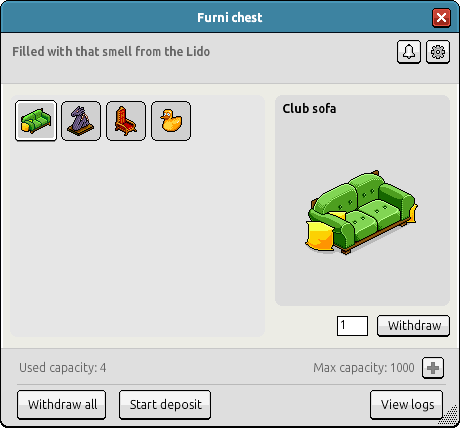 Además, habrá varios filtros para la búsqueda de un movimiento concreto, tales como depósitos o retiradas, tipo de furni, cantidad específica de furnis o créditos…