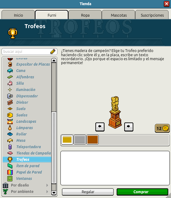 [INT] Regreso: Trofeos especiales Hace 3 años -d-selene-b- 10 Popular Archivada Información de la publicación Publicada: 19/01/2023 13:35:57 H.P.E. Autor: -d-selene-b- Último comentario:@ngelytox Ir Visitas: 509 Información general Categoría: Trofeos Tipo: Furni Precio: 12 Fecha de inicio de venta: 19/01/23 Fecha de final de venta: Desconocido Lugar de venta: Tienda Imágenes del catálogo