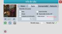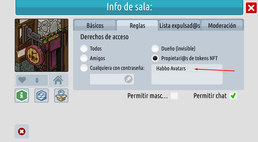 Entra a tu sala y haz clic en el botón verde »Info de sala» y luego en el botón del engranaje o de la rueda dentada »Ajustes». En la pestaña de »Reglas» hay un nuevo apartado llamado »NFT Token Holders» en el que podrás decidir qué usuarios pueden acceder a tu sala en función de los NFT que poseen. Podrás elegir entre las colecciones NFT: Metakey, Cyberkongz, MetaverseHQ y Habbo Avatars.