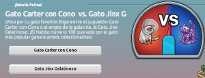 ¡Vota por tu gato favorito! Elige entre el juguetón Carter con Cono o el amante de la gelatina: Jinx Gelatinoso. Si eres el Habbo número 100 que ha votado por el gato más popular, ganarás ambos coleccionables.