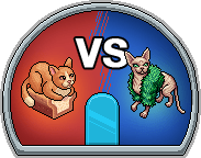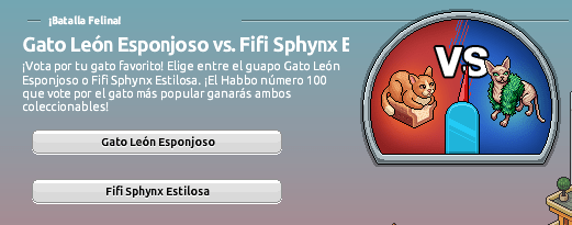 ¡Vota por tu gato favorito! Elige entre el apuesto León Esponjoso y la fashionista Fifi Sphynx Estilosa. Si eres el Habbo número 100 que ha votado por el gato más popular, ganarás ambos coleccionables