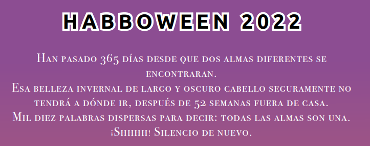 En este mes de Habboween están llegando muchas sorpresas terroríficas al hotel, hace poco se vio una figura extraña hacer acto de presencia, los pocos que han podido verle dicen que lleva una capa larga y unos comillos muy afilados, se dice que se encuentra en un lugar muy remoto, escondido a la simple vista de los usuarios y al parecer oculta un gran tesoro ¿Quieres saber más? ¡Continúa leyendo!